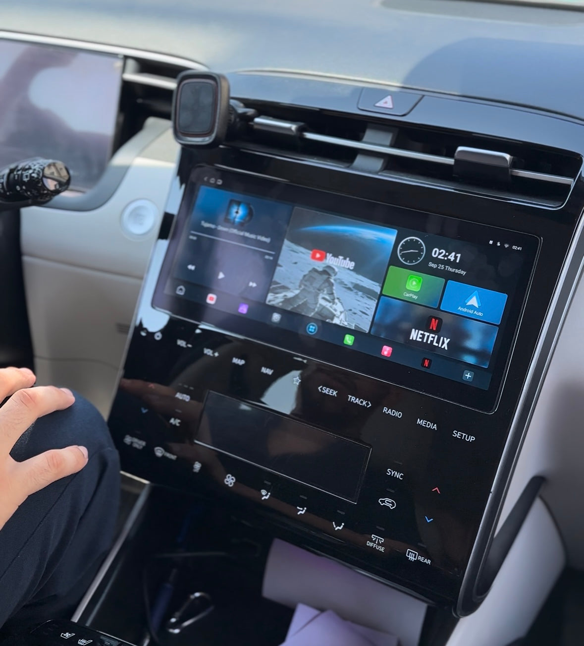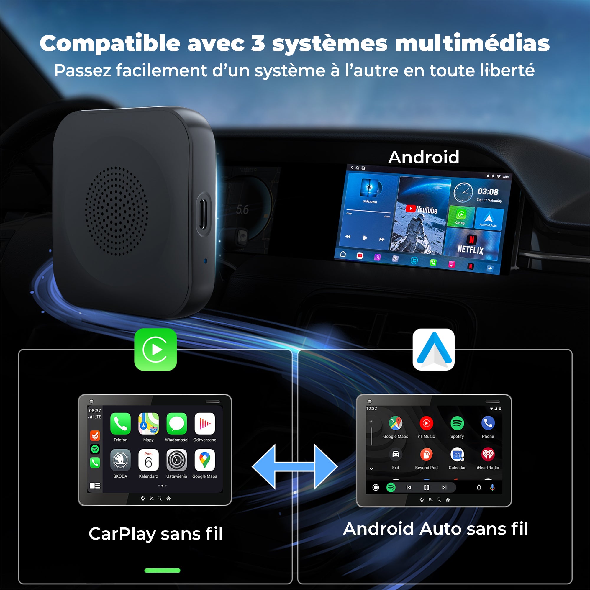 Il transforme votre système CarPlay/Android Auto filaire en une connexion sans fil via Wi-Fi et Bluetooth. Il vous donne également accès à YouTube et Netflix directement sur l'écran de votre voiture.